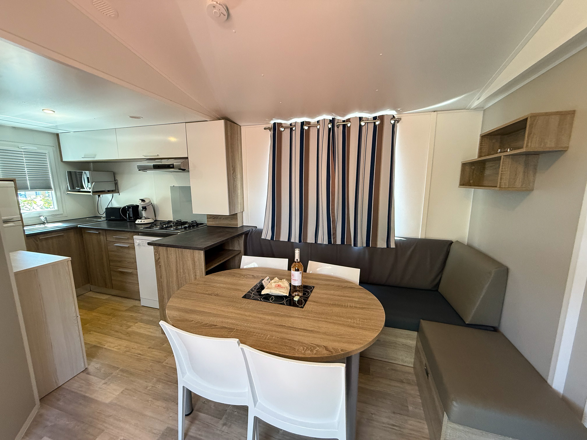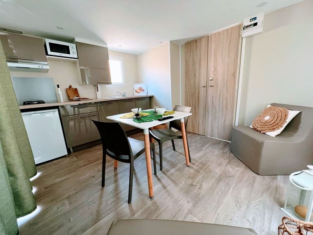 - Cuisine équipée, frigo top, gaz ou plaque vitrocéramique, micro-ondes, cafetière